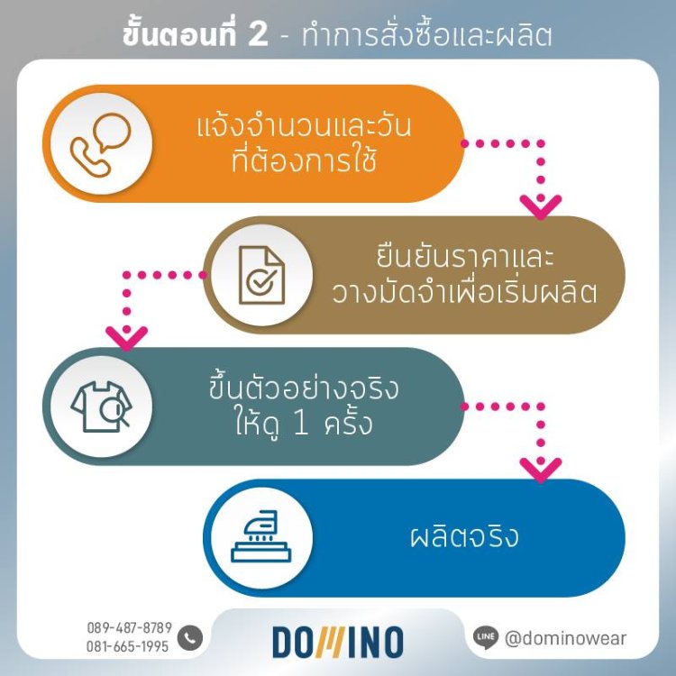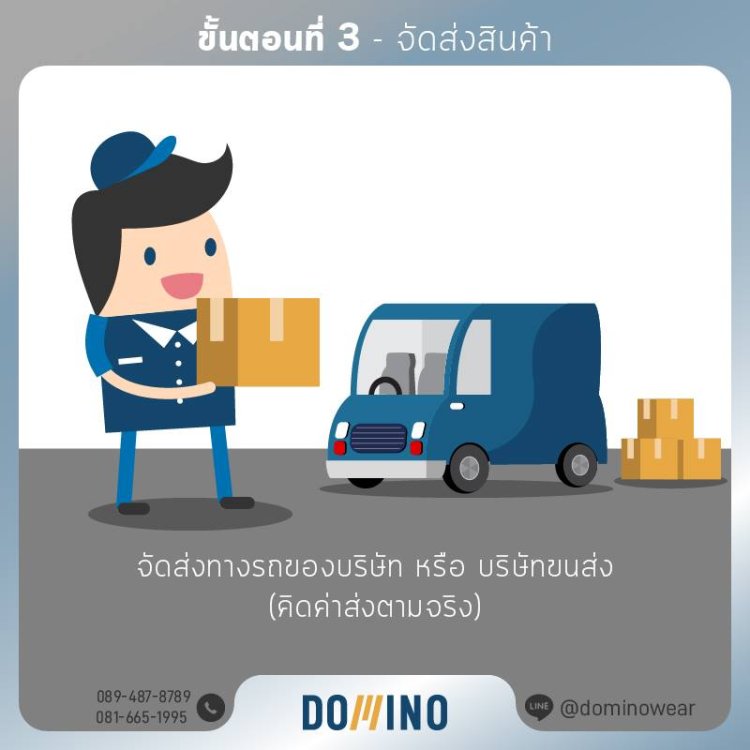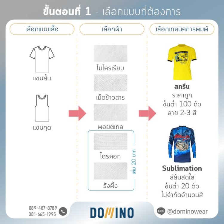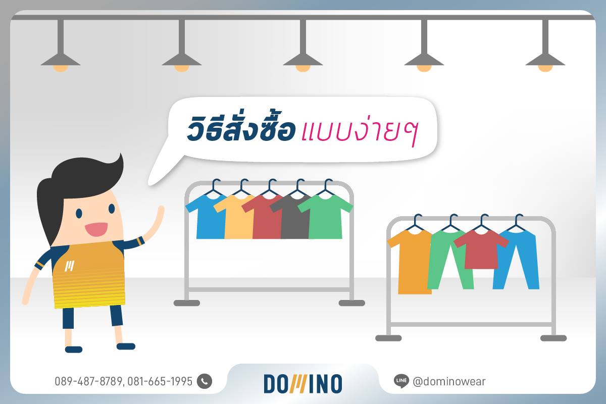 - เมื่อลูกค้ากำหนดแบบเสื้อที่ต้องการแล้ว อย่าลืมส่ง Artwork ลายสกรีน/โลโก้/ลายพิมพ์ พร้อมจำนวน และวันที่ต้องการใช้งาน มาที่ dominowear@hotmail.com
